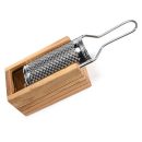 Grate Parmesan and other hard cheeses with less mess. This handy Parmesan grater features a stainless steel hand grater that slides into an olive wood receptacle. Simply rub the cheese on the grater’s curved surface and the cut cheese falls right into the box-shaped holder for less mess and crumbs on the counter. Slide out the grater and empty the holder into a bowl or with other mixed ingredients.
